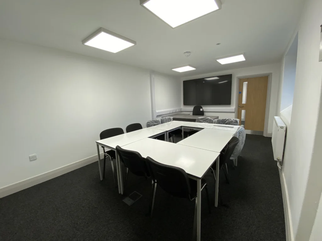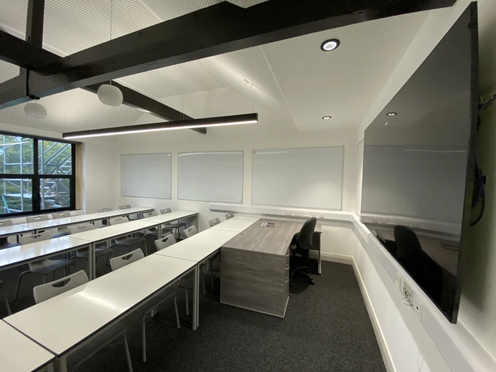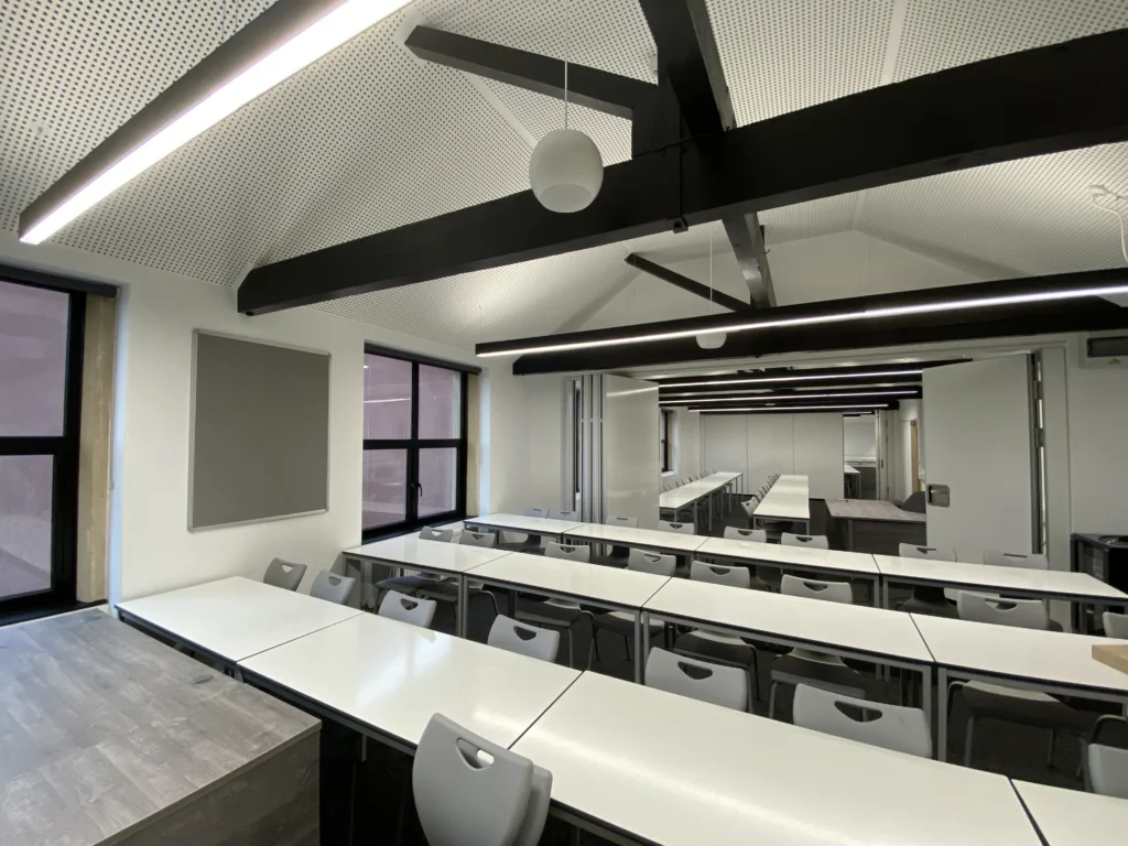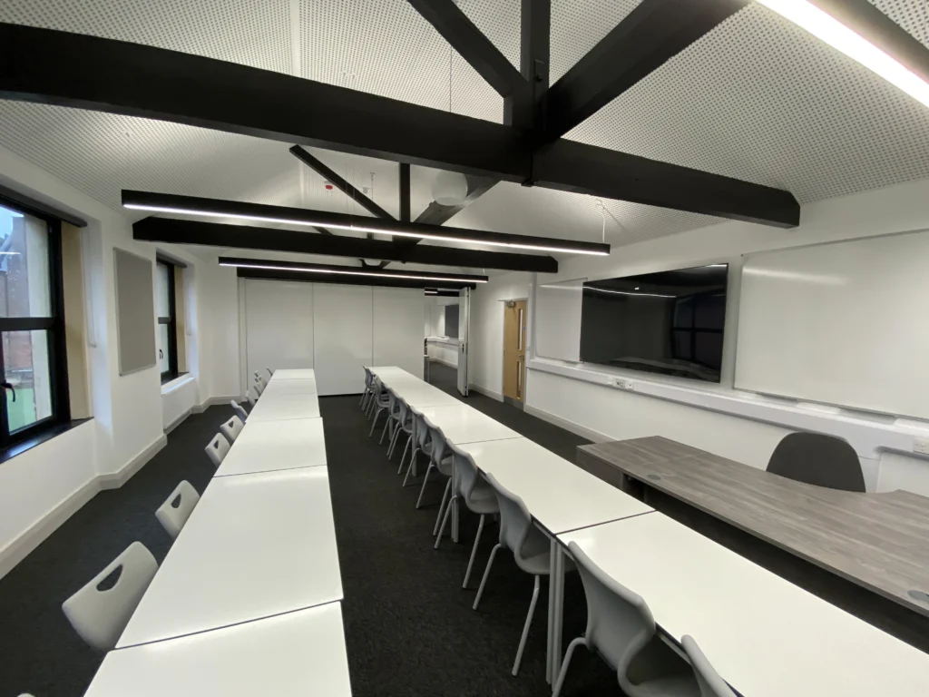 This project at an independent school in Tiverton involved the installation of new partitions, ceilings, doors, and floor finishes, complemented by bespoke timber trims including linings, architraves, and skirtings. Works also included associated M&E installations and alterations – such as fire alarm upgrades – alongside full redecoration.