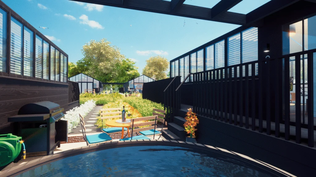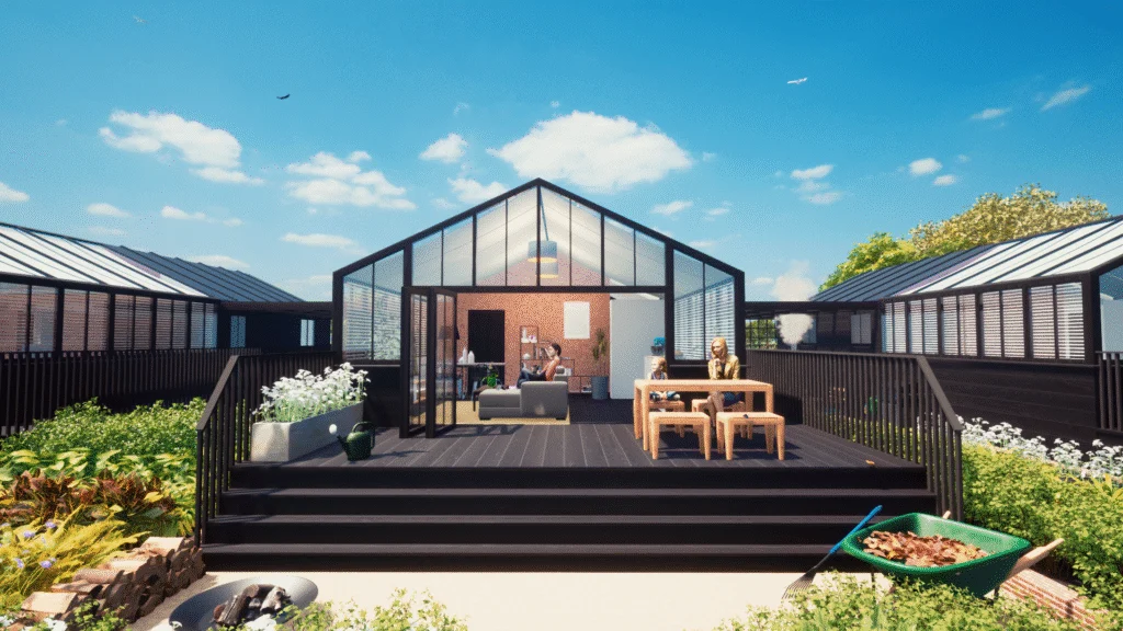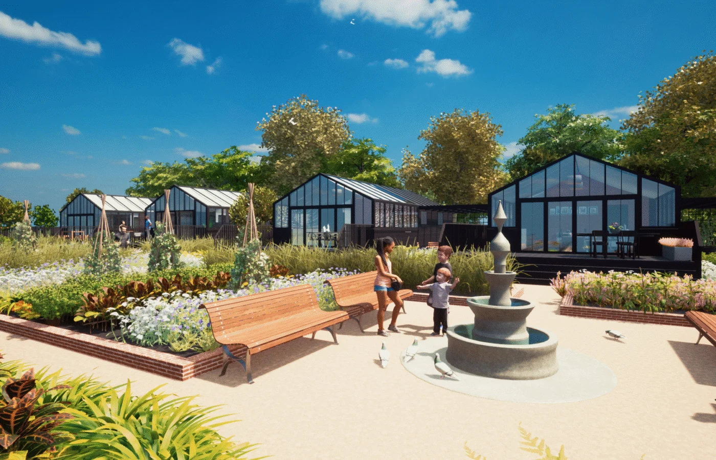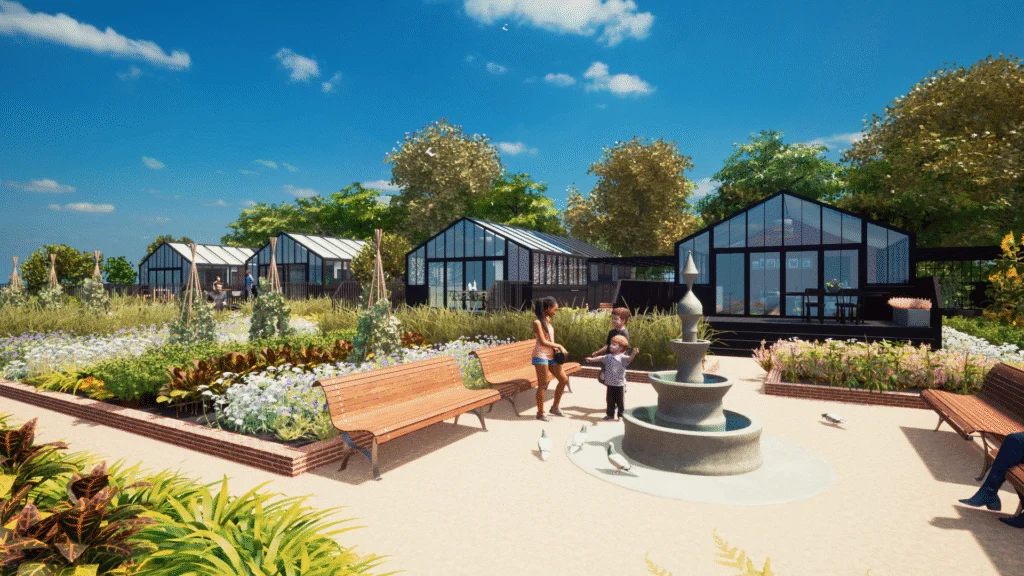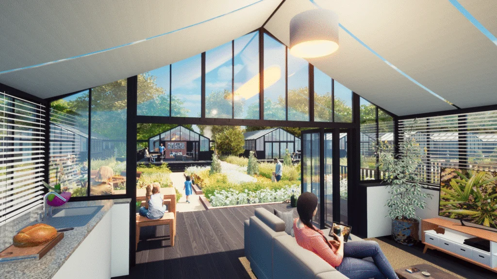 Our clients instructed the creation of a bespoke horticultural village which would allow their guests to sleep within greenhouse style dwellings, and rest within a cultivated landscape that they may also wish to tend. Flowers and Food grown within the village would be managed by the clients landscaping team to ensure quality and compliance, and once harvested the foodstuffs would be prepared for dining in the park’s own restaurant.